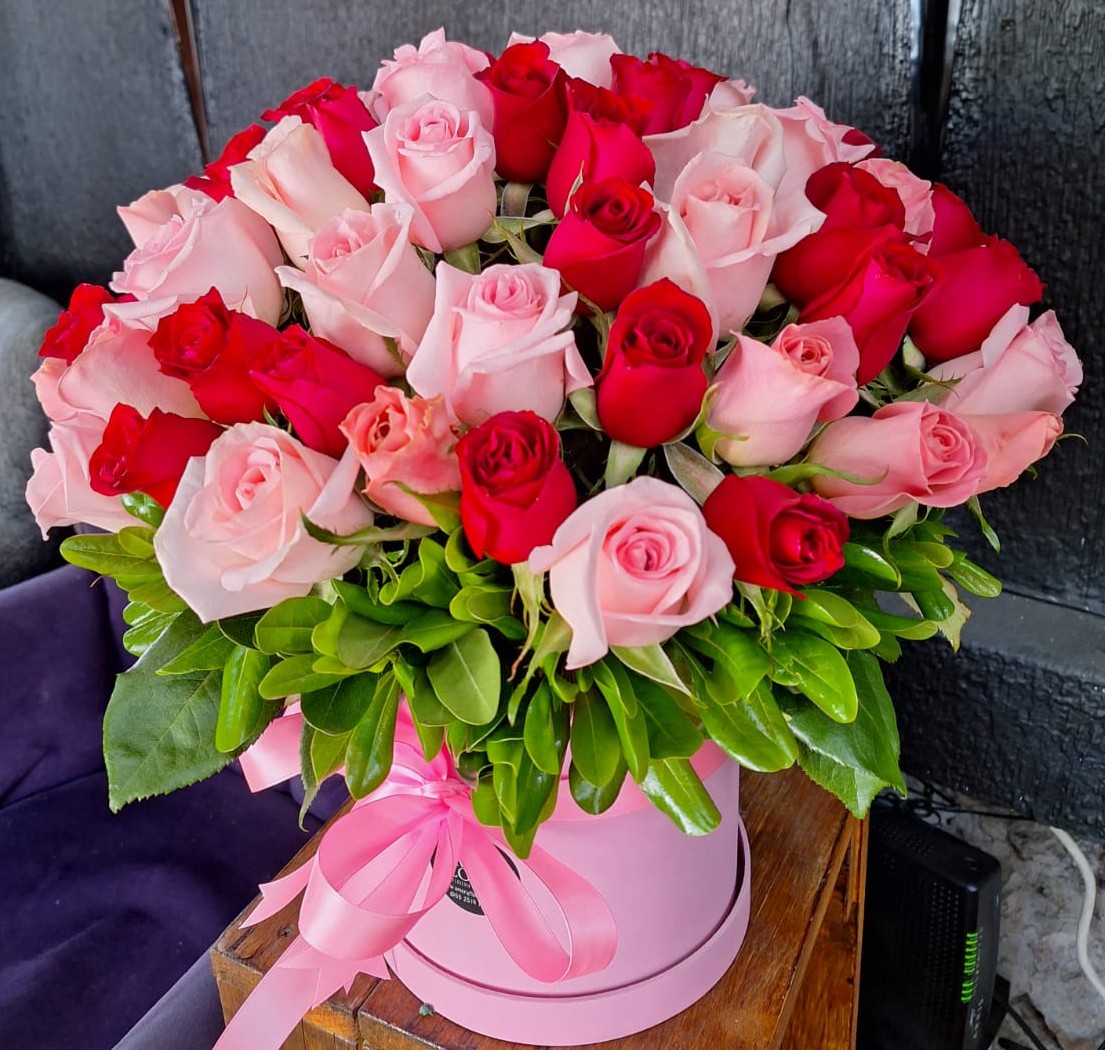 CAJA FLORAL CON 50 ROSAS ROJAS Y ROSAS