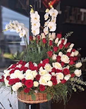 ARREGLO FLORAL CON 150 ROSAS Y DOS PLANTAS DE ORQUIDEAS