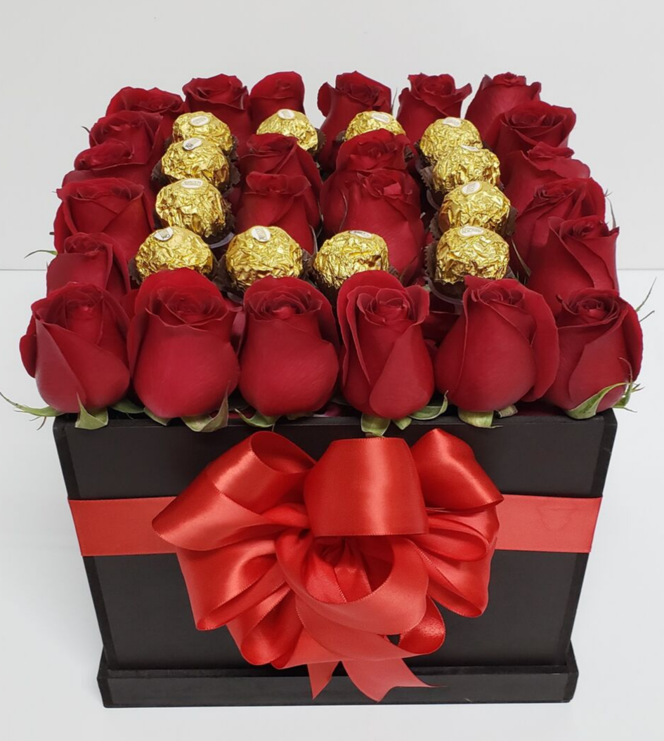 Arreglo floral con 24 rosas acompañadas de chocolates