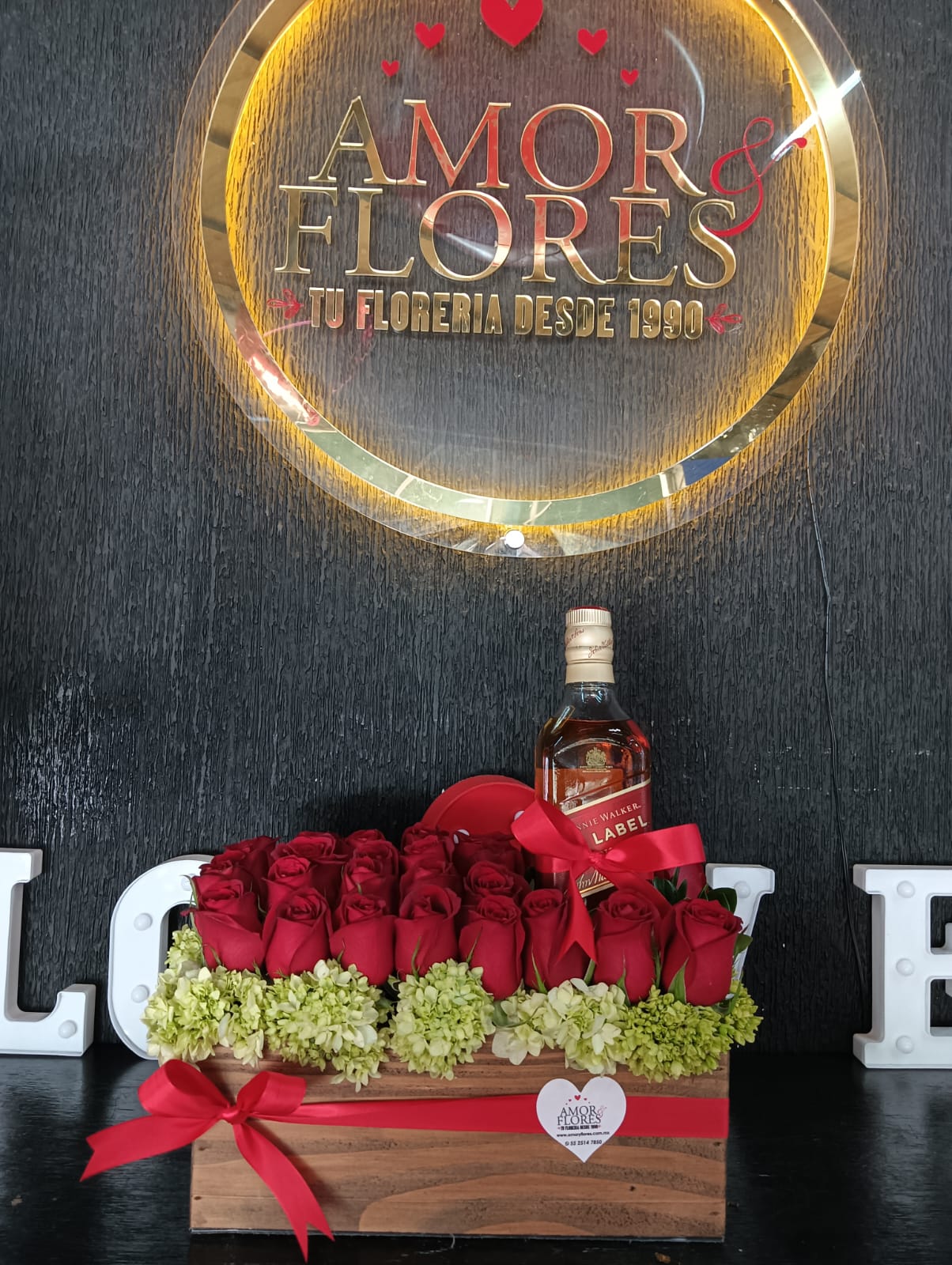 Arreglo con 24 rosas, la botella es por aparte a elección del cliente.