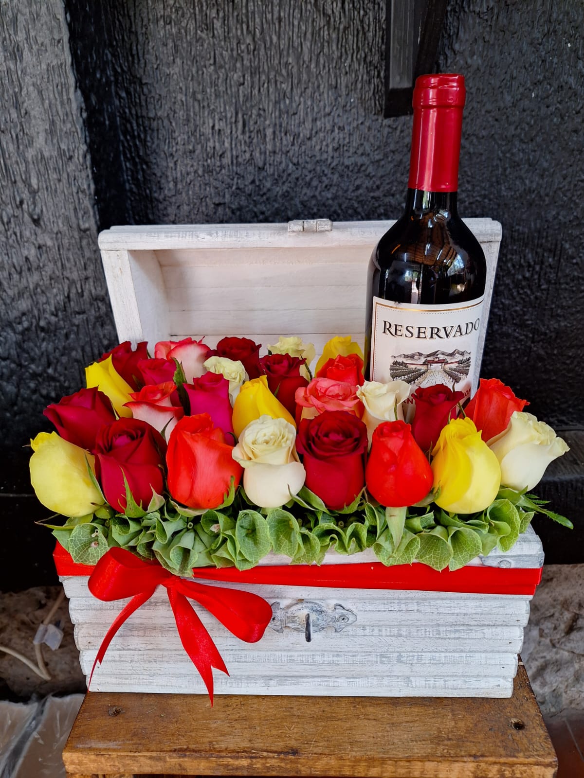 Arreglo floral con 24 rosas de colores y una botella de vino ( el costo de la botella es por aparte debido a que el cliente puede elegir la marca de la misma)