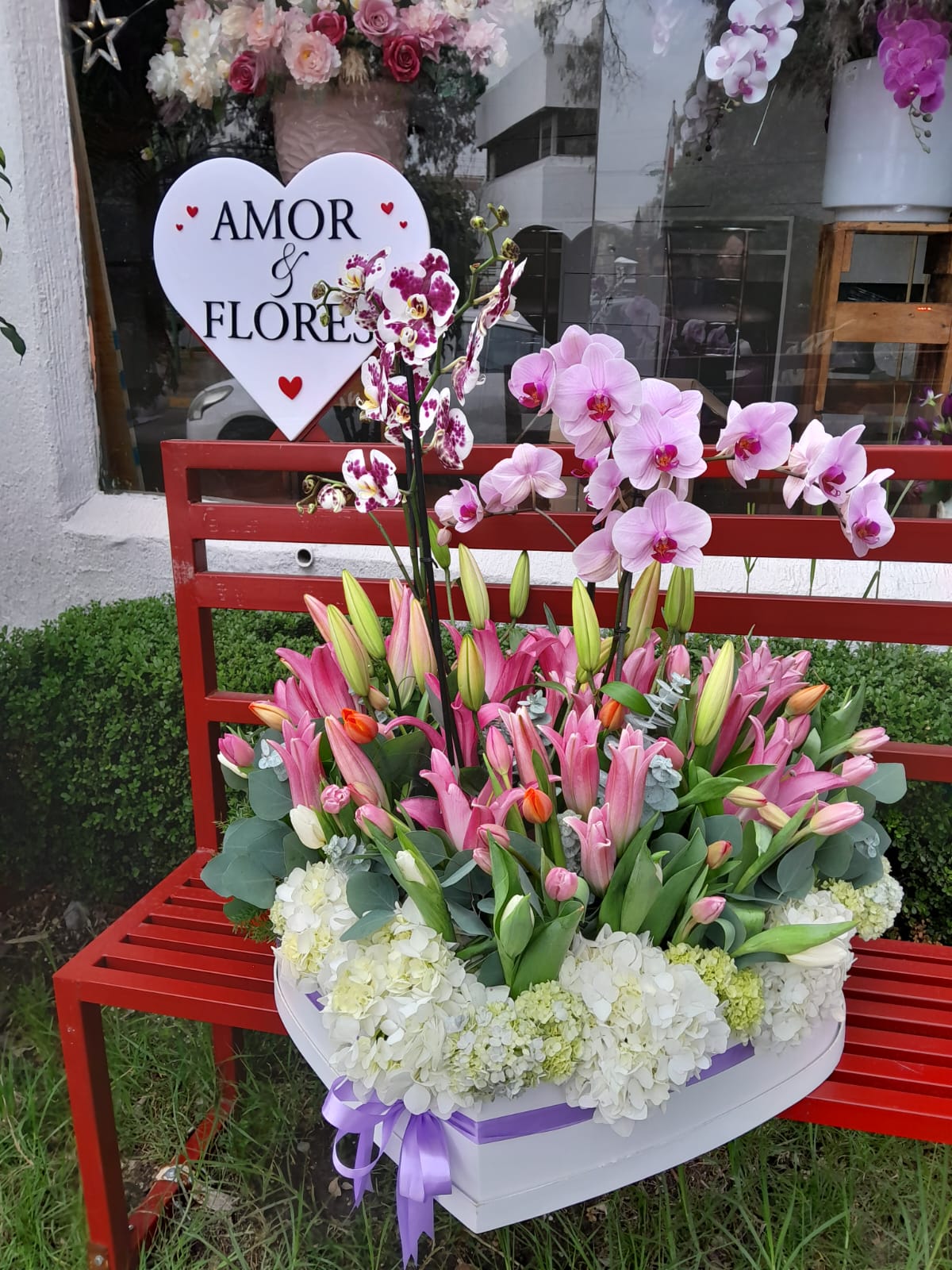Hermoso arreglo floral con 50 tulipanes, acapulcos, dos plantas de orquideas, acompañados de hortensias.