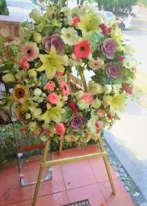 ELEGANTE CORONA FUNEBRE MONTADA EN UN PEDESTAL.