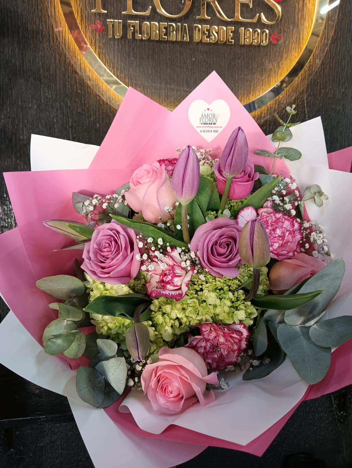 RAMO FLORAL CON 5 TULIPANES Y 6 ROSAS DISEÑO HERMOSO