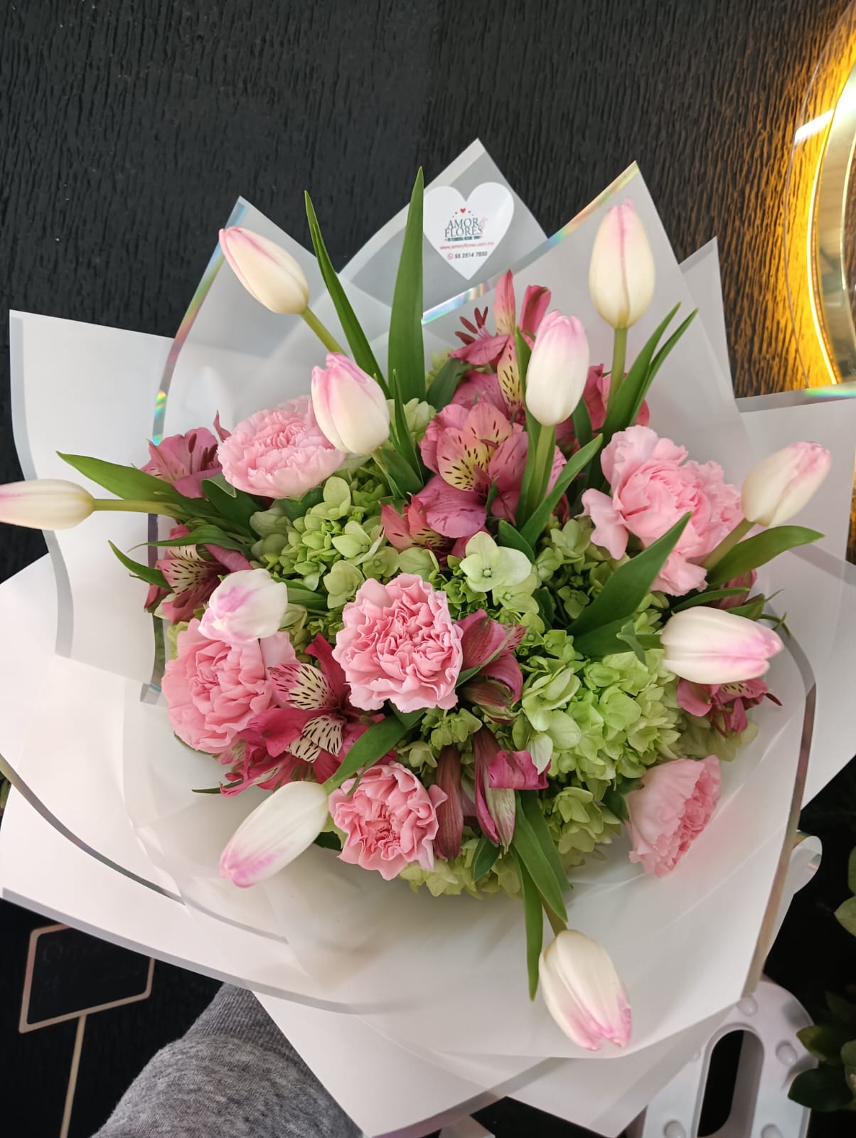 RAMO FLORAL CON 10 TULIPANES ACOMPAÑADOS DE FOLLAJES HERMOSOS
