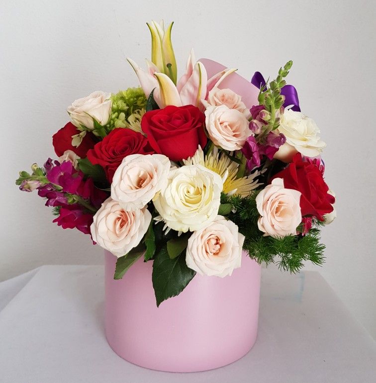 HERMOSO ARREGLO CON ROSAS EN DIFERENTES TONOS EN ELEGANTE BASE.