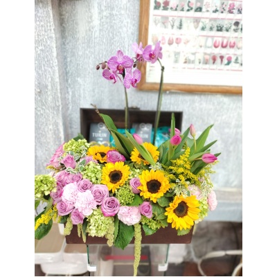 Arreglo flral en baul con 24 rosas, 5 tulipanes y una planta de una hermosa orquídea