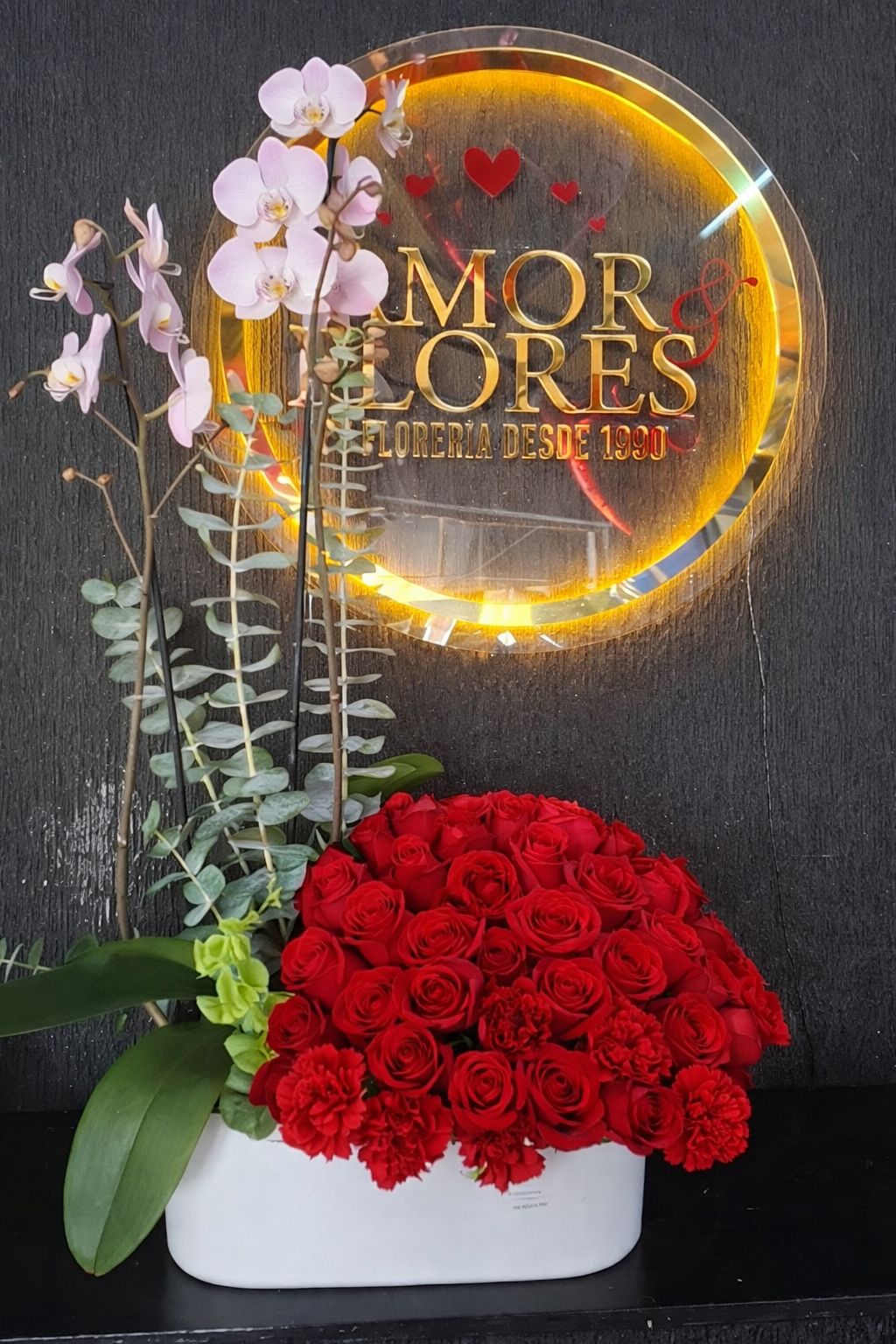 DISEÑO FLORAL CON BOUQUET DE 50 ROSAS Y UNA PLANTA DE ORQUIDEA (EL COLOR DE LA ORQUIDEA ES DE ACUERDO A EXISTENCIA)
