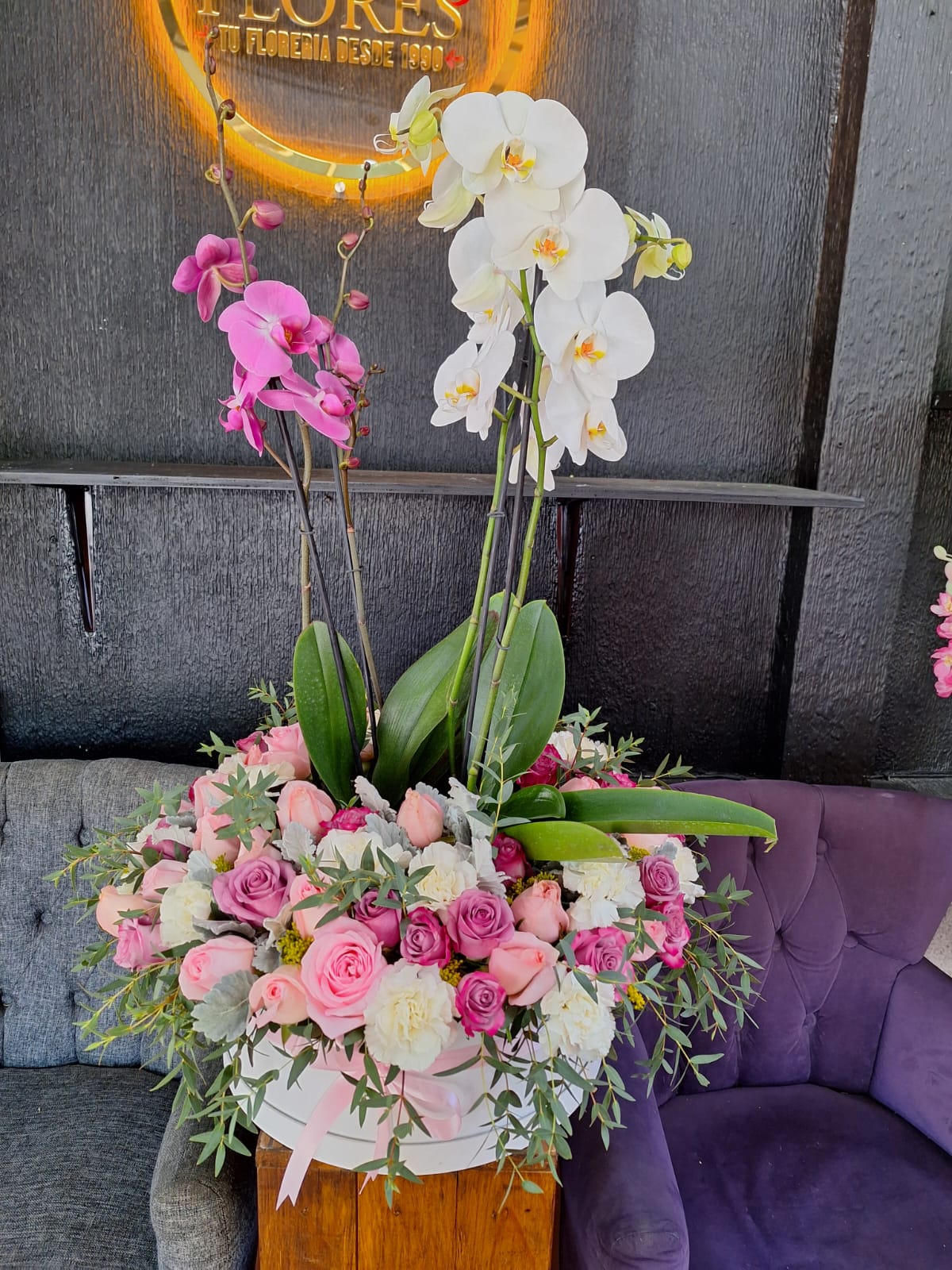 CAJA FLORAL CON 100 ROSAS y HERMOSOS CLAVELES Y DOS PLANTAS DE ORQUIDEAS , ( EL COLOR DE ORQUIDEA PUEDE VARIAR DE ACUERDO A EXISTENCIA)