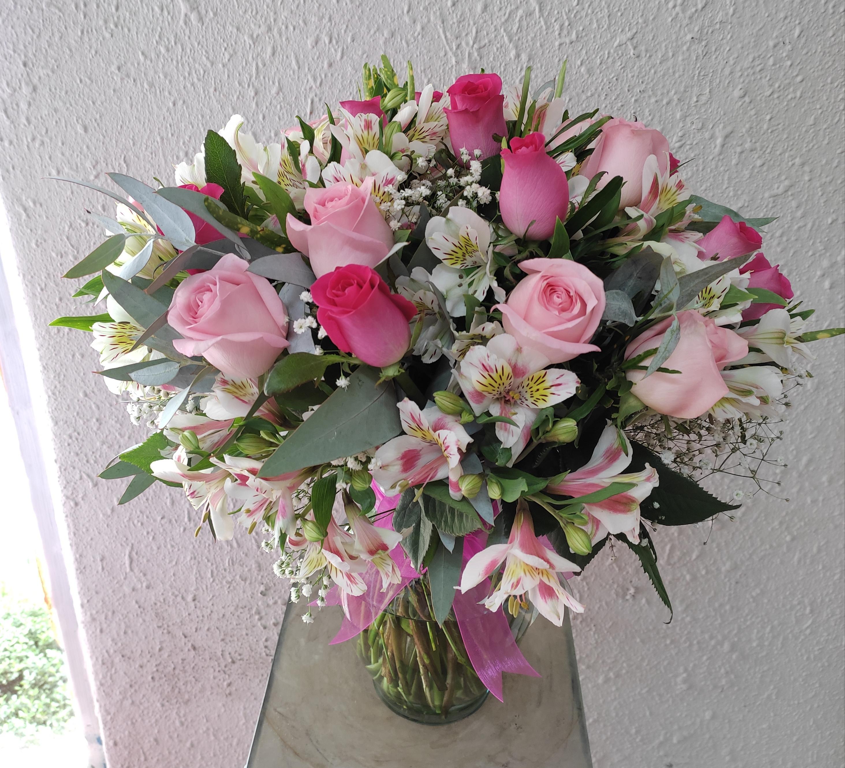 HERMOSO ARREGLO. EN FLORERO DE VIDRIO, CON ROSAS Y ASTROMELIAS,EN TONOS PALTEL.