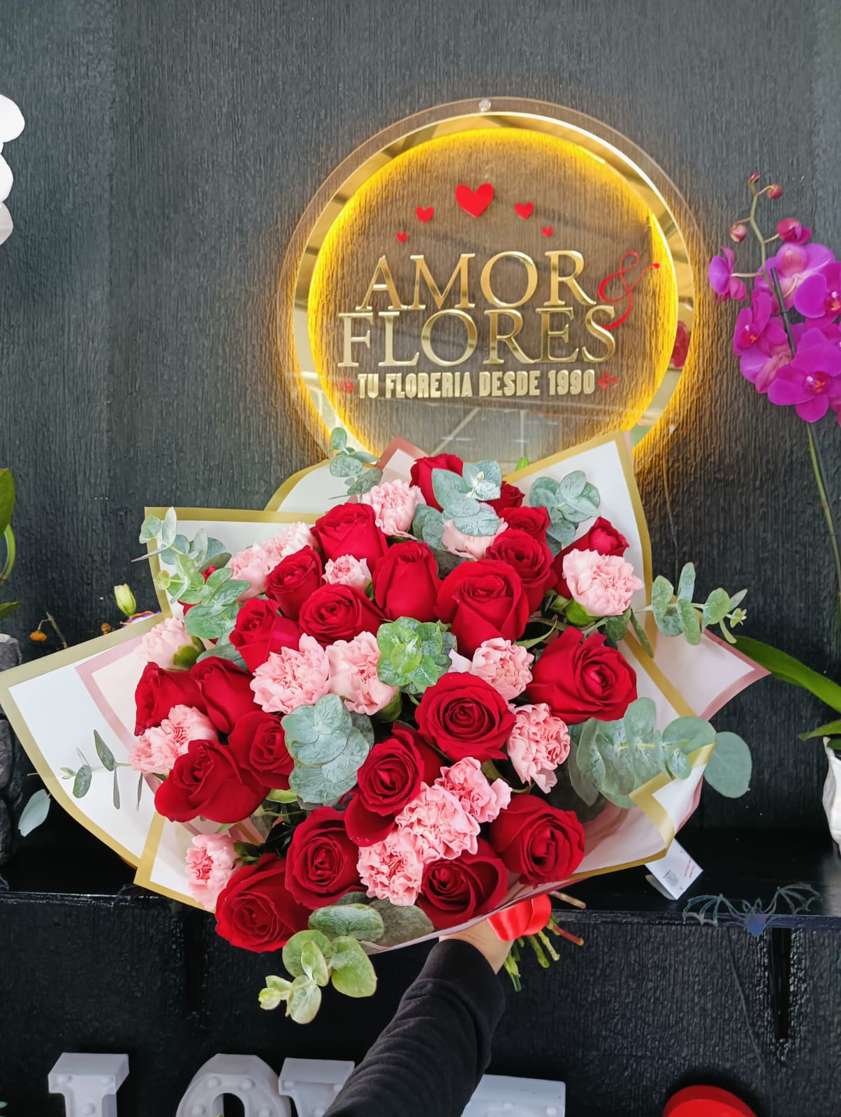 RAMO FLORAL CON 24 ROSAS ACOMPAÑADO DE CLAVES HERMOSOS