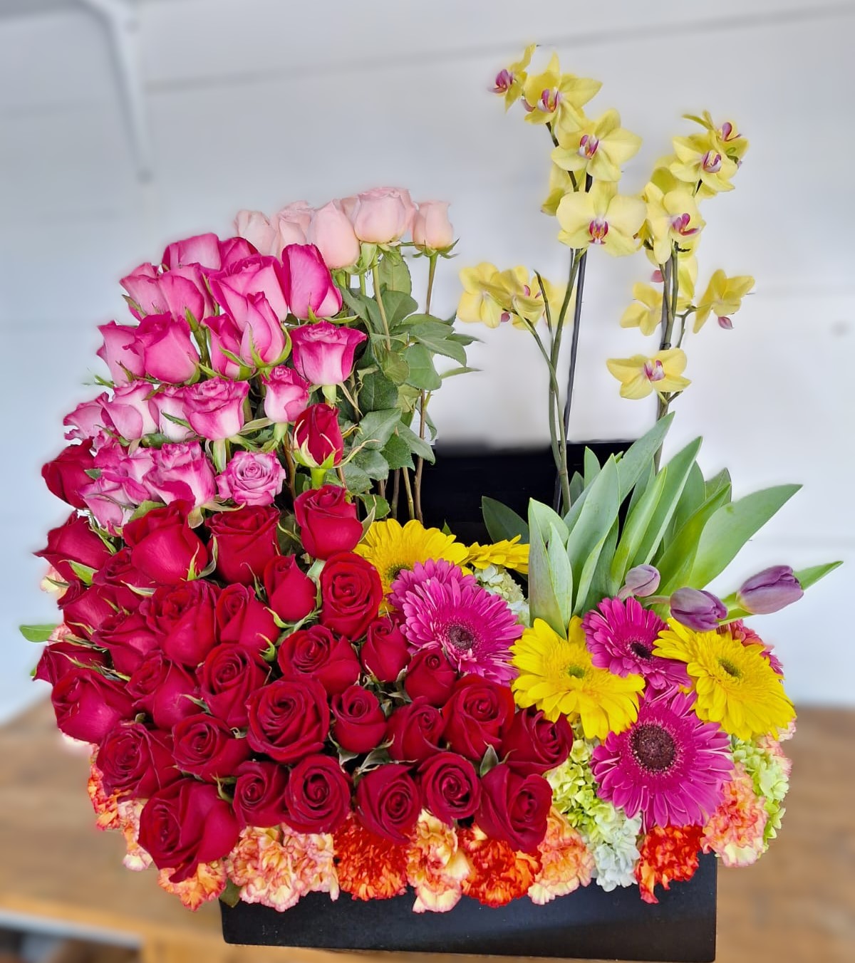 Arreglo floral en baul con 5o rosas, tulipanes, gerberas y orquídea hermosa