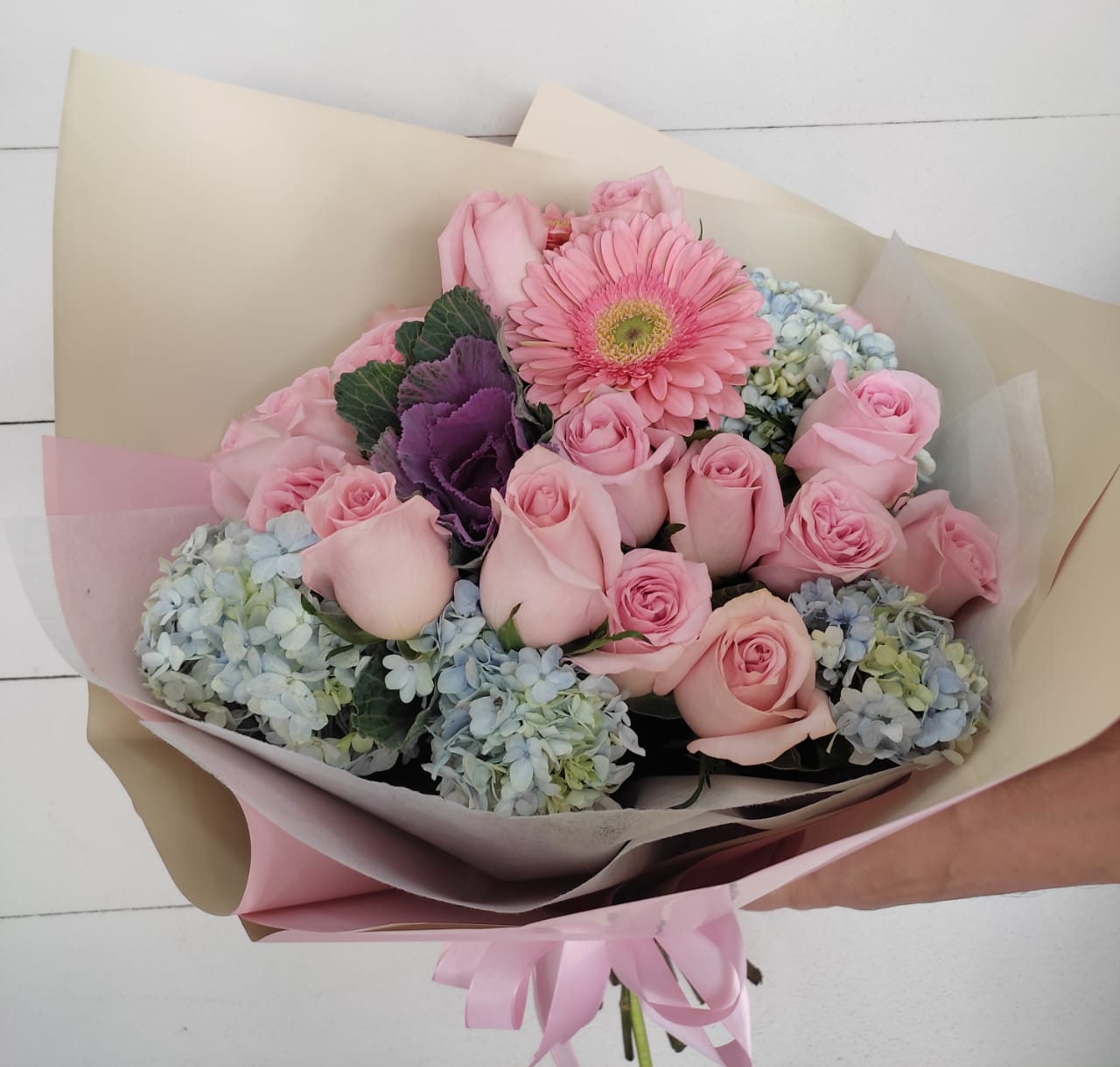 15 ROSAS ACOMPAÑADAS DE HORTENSIAS Y GERBERAS