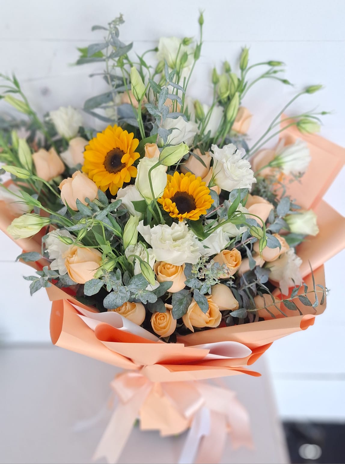 RAMO DE GIRASOLES CON LISIANTHUS Y ROSAS