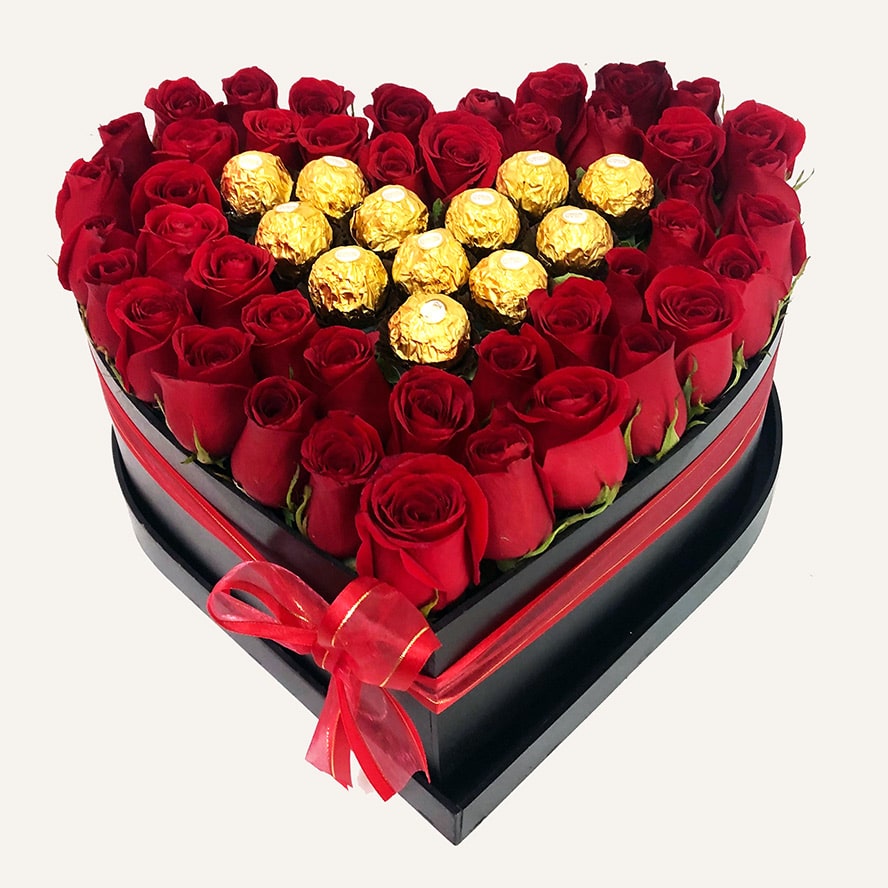 CAJA FLORAL CON 45 ROSAS ROJAS Y 12 CHOCOLATES