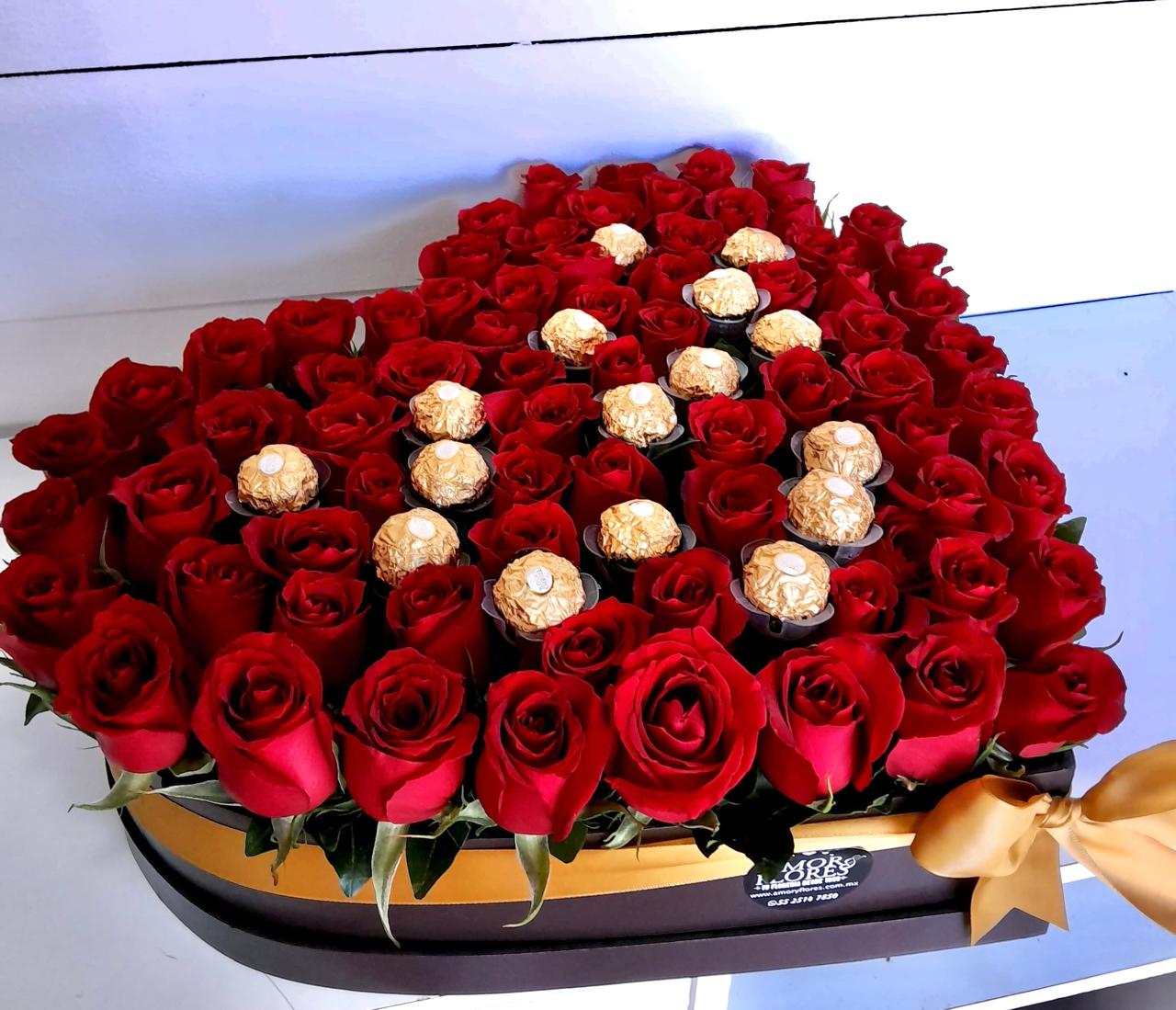 CAJA FLORAL EN FORMA DE CORAZON CON 100 ROSAS Y 16 CHOCOLATES