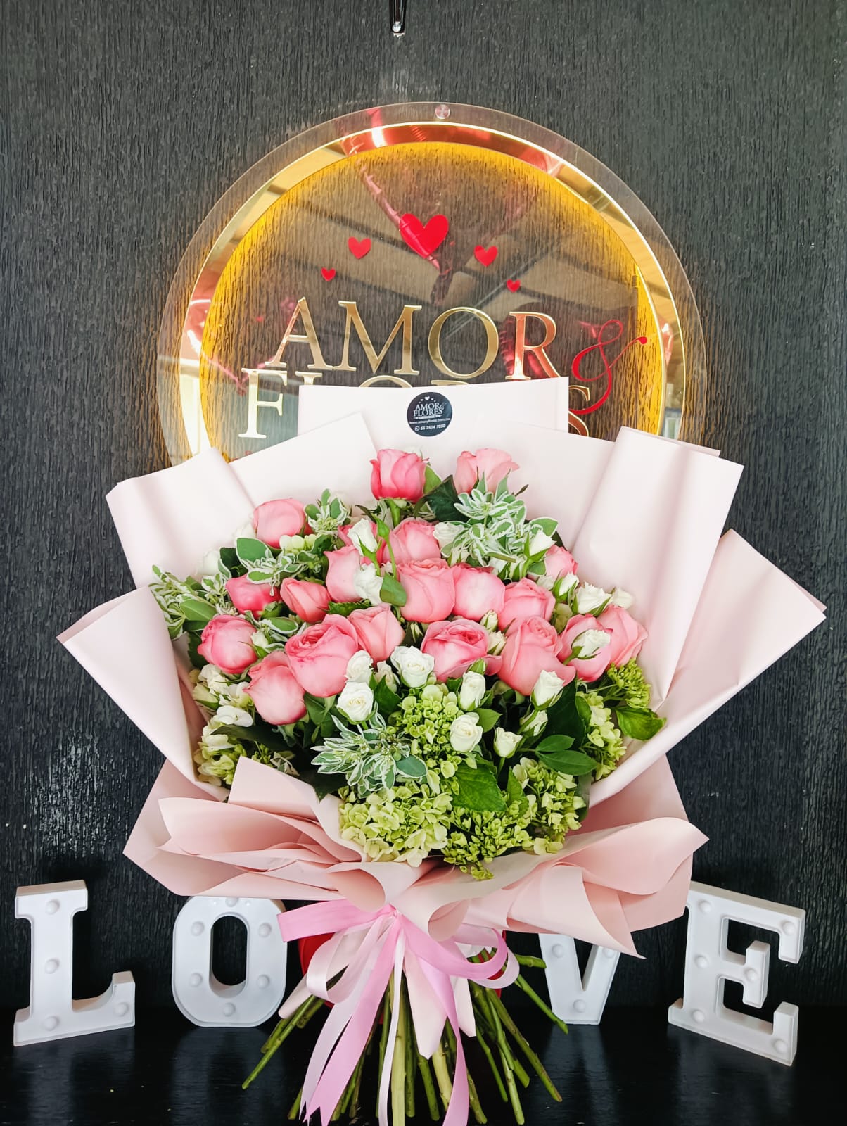 RAMO FLORAL CON 20 ROSAS Y ROSA BABY , DISEÑO HERMOSO