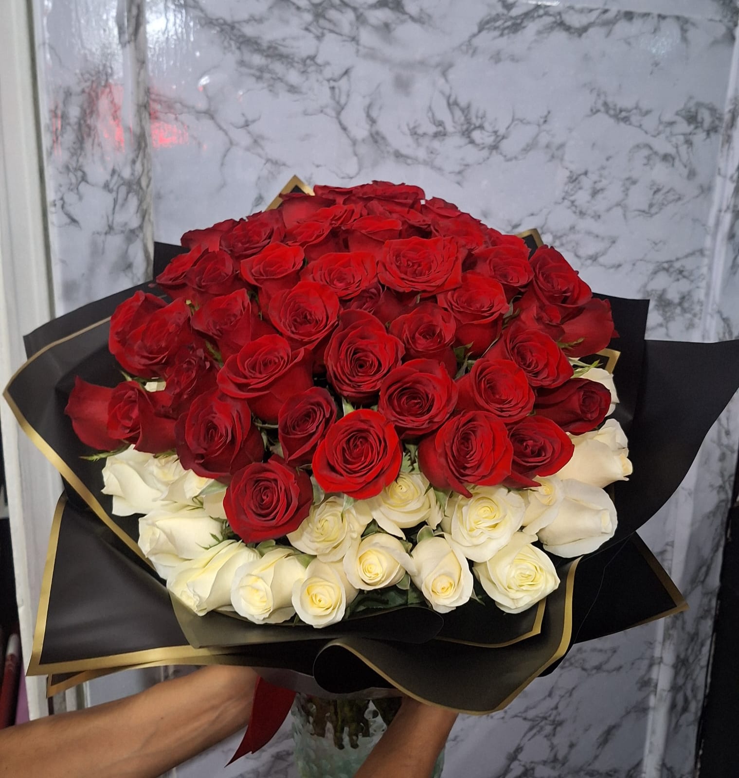 RAMO FLORAL CON 100 ROSAS , 50 ROSAS ROJAS Y 50 BLANCAS.