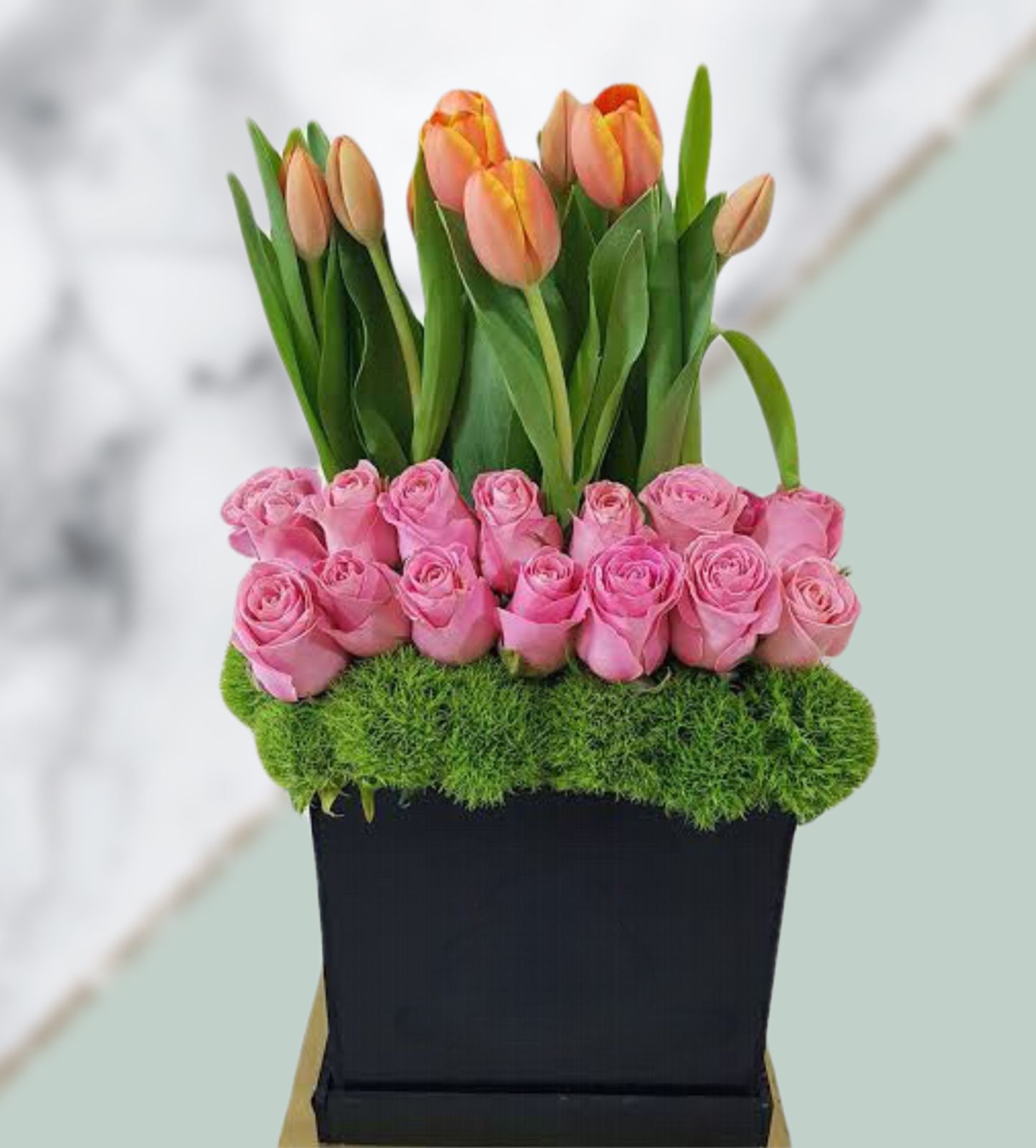 40 ROSAS CON 10 TULIPANES AL CENTRO