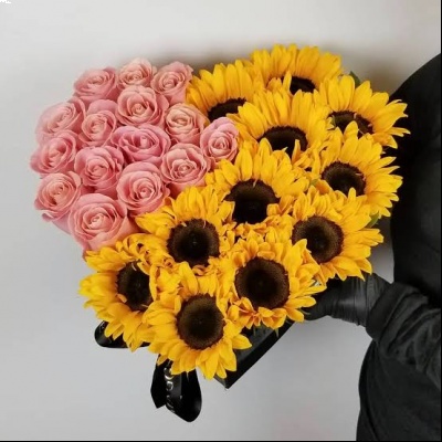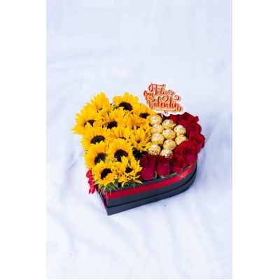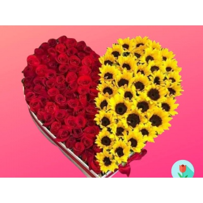 CORAZON CON 15 ROSAS Y 10 GIRASOLES