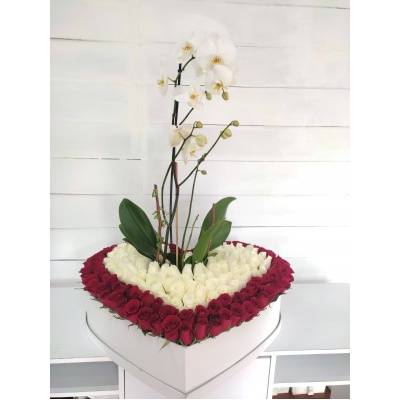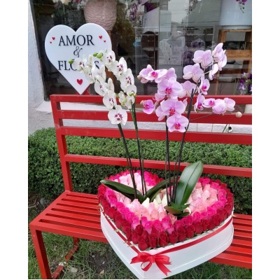 CORAZON CON 200 ROSAS Y DOS PLANTAS DE ORQUIDEAS