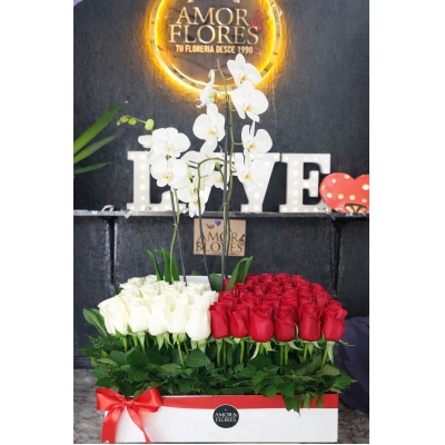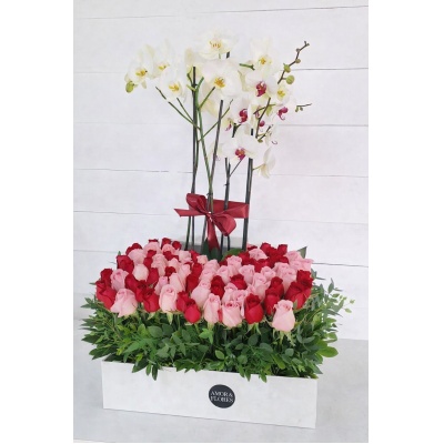 Arreglo con 100 rosas y dos plantas de orquideas.Mamá, eres la razón de mi existir, la luz que ilumina mi