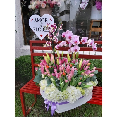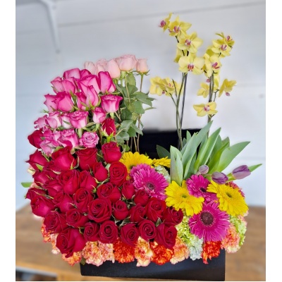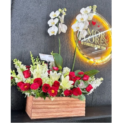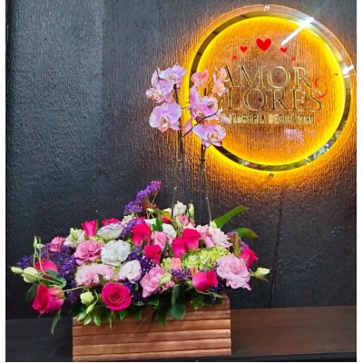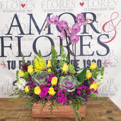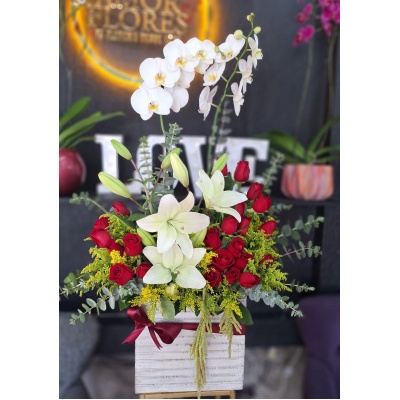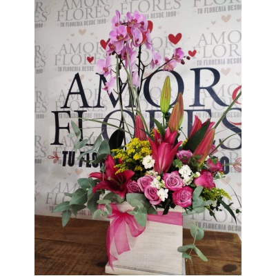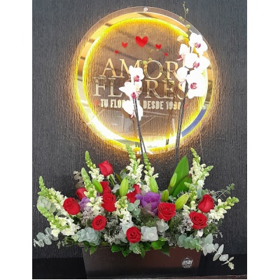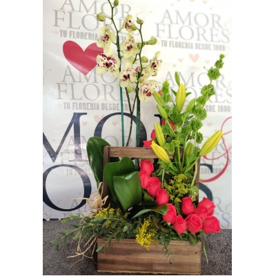 ESPECTACULAR ARREGLO CON ROSAS Y MINI ROSAS, ORQUIDEAS Y FOLLAJES QUE HARAN QUE LATA TU CORAZON ❤️