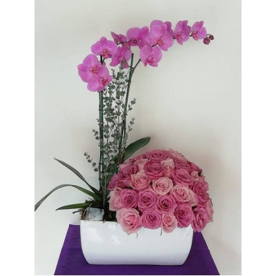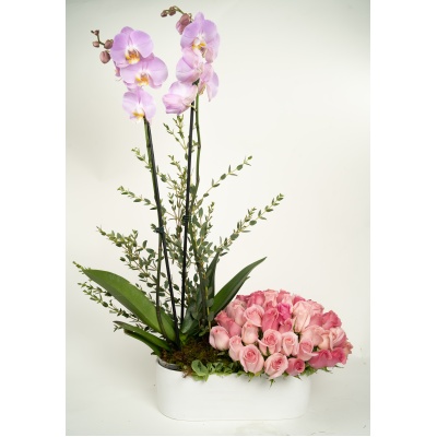PLANTA DE ORQUIDEA ACOMPAÑADA DE 50 ROSAS