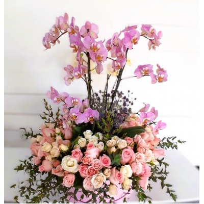 Arreglo floral con 70 rosas y dos plantas de orquideasEres mi mejor confidente y mi mayor inspiración.
