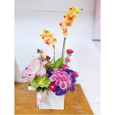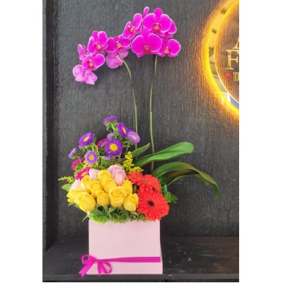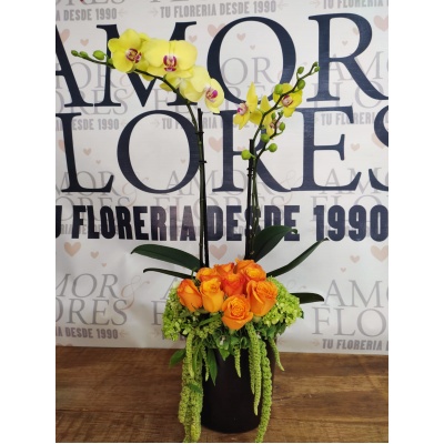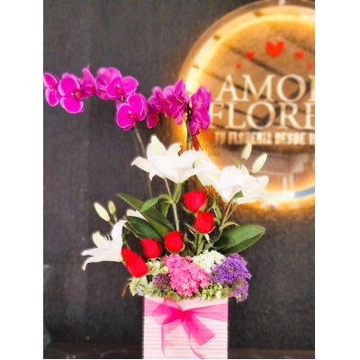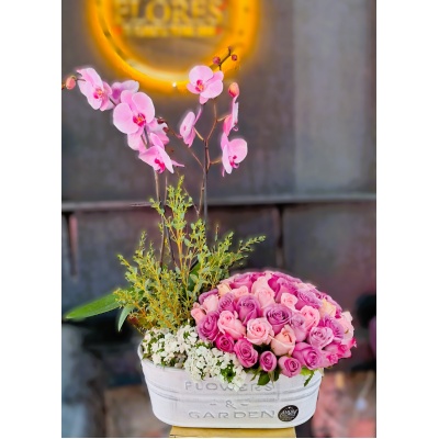 Arreglo floral con 50 rosas y una planta de orquídea"El amor incondicional existe, y lleva tu nombre. ¡Feliz día de
