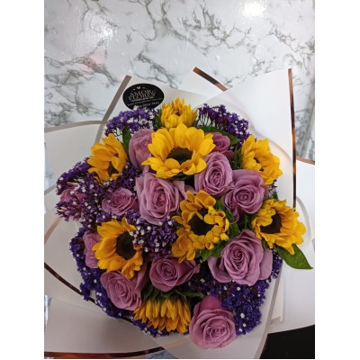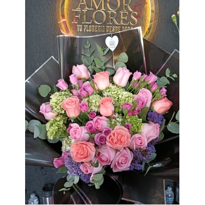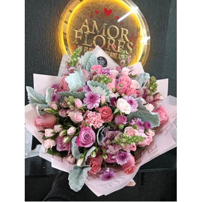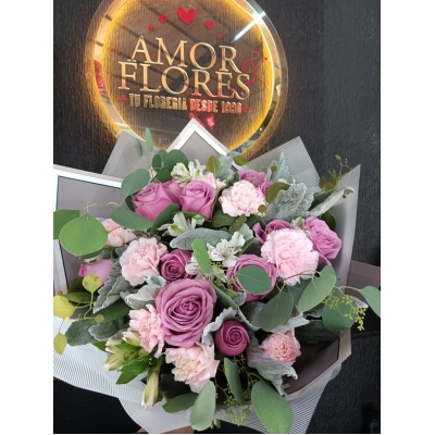 RAMO FLORAL DE ROSAS CON TONALIDADES MORADAS Y ROSAS