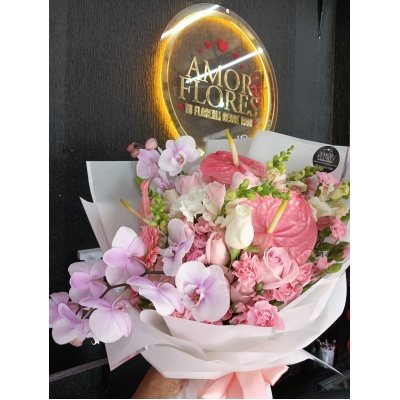 RAMO FLORAL CON ORQUIDEAS Y ANTURIOS , PERFECTO PARA ENAMORAR CON MUCHA ELEGANCIA