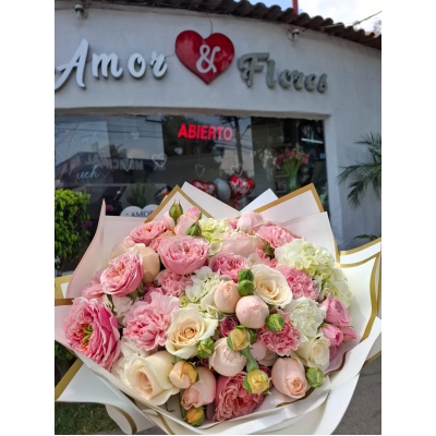 RAMO FLORAL CON 10 ROSAS INGLESAS Y CLAVELES , ESPECTACULAR DISEÑO EN TONOS PASTELES