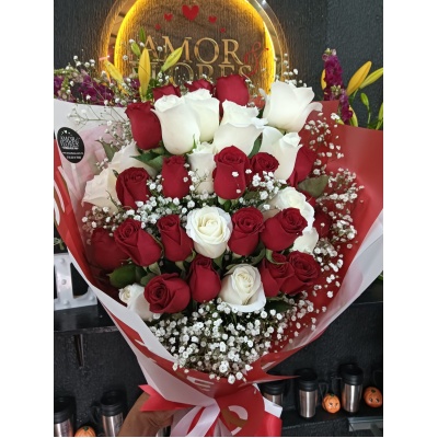 RAMO FLORAL CON 36 ROSAS ROJAS Y BLANCAS