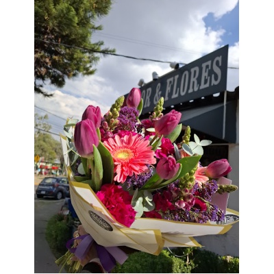 RAMO FLORAL CON 6 TULIPANES ACOMPADOS DE GERBERAS