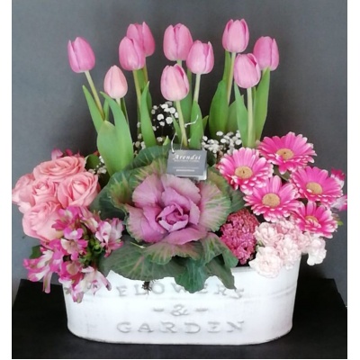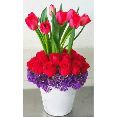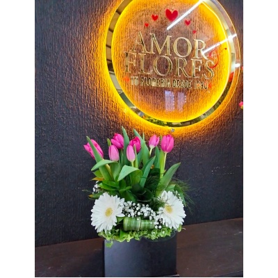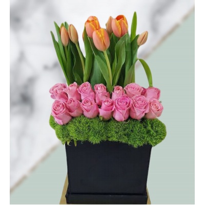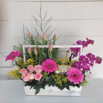 PLANTA DE ORQUIDEA CON 8 TULIPANES Y ROSAS