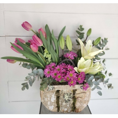 HERMOSA BASE DE CORTEZA DE ARBOL CON 10 TULIPANES